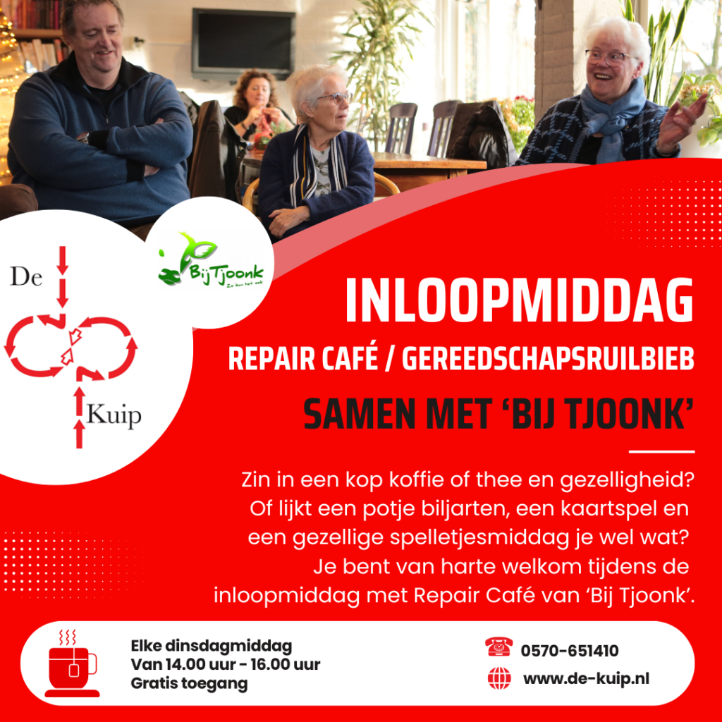 Heeft u een apparaat dat niet meer werkt en lukt het maar niet om het weer aan de praat te krijgen? Geen zorgen! Tijdens het Repair Café staan de medewerkers van de klussendienst van Bij Tjoonk voor u klaar om samen te kijken of uw apparaat gerepareerd kan worden.