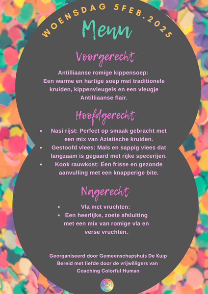 Voor een kleine vergoeding kunt u samen met buurtgenoten aanschuiven voor een smakelijke en gezellige maaltijd. Denk bijvoorbeeld aan een winterse Hollandse stamppot, een heerlijke Indische nasi, of mosselen met knapperige frietjes. Natuurlijk mag een lekker toetje niet ontbreken!